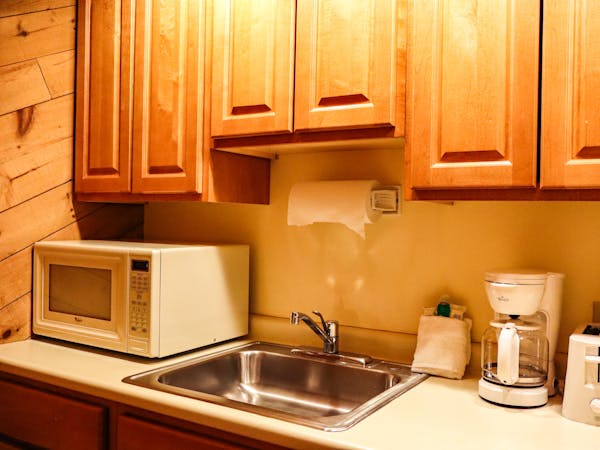 - Kitchenette with full size fridge, microwave, toaster, coffee maker, table, chairs, counter top, cabinets and sink (no oven/stove)