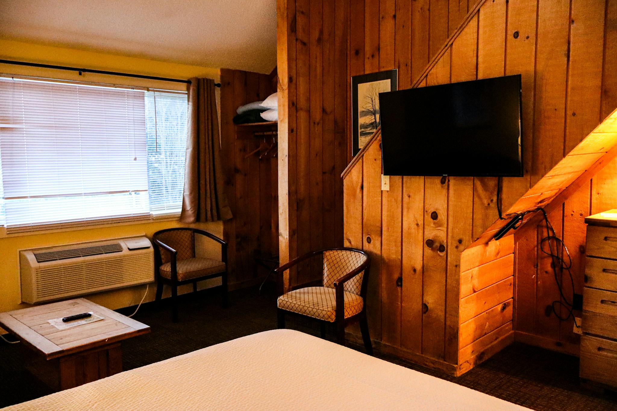 - Flat Screen Cable TV, Wet Bar, Mini-Fridge, Alarm Clock Radio, Hair Dryer, in-room controlled AC and heat