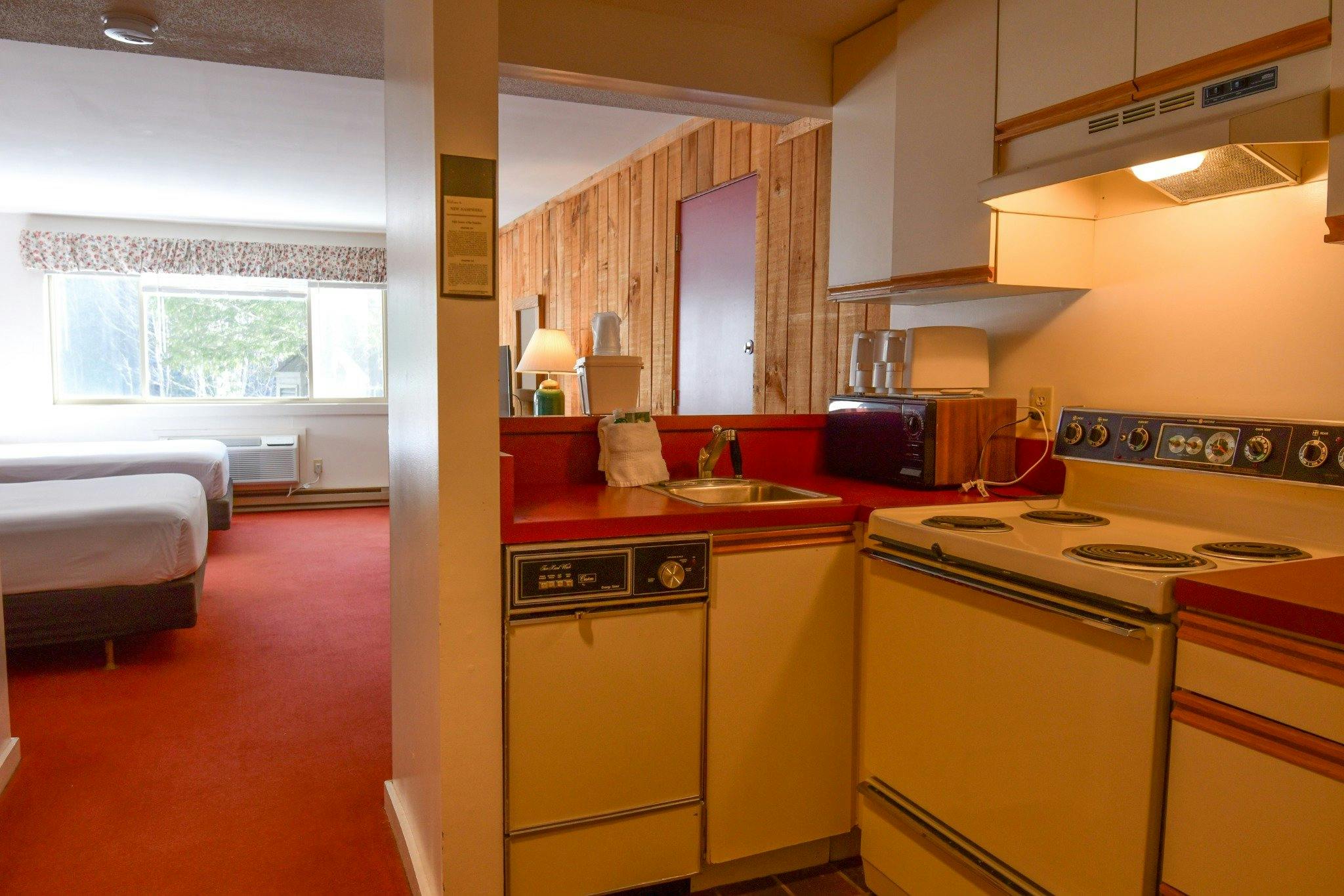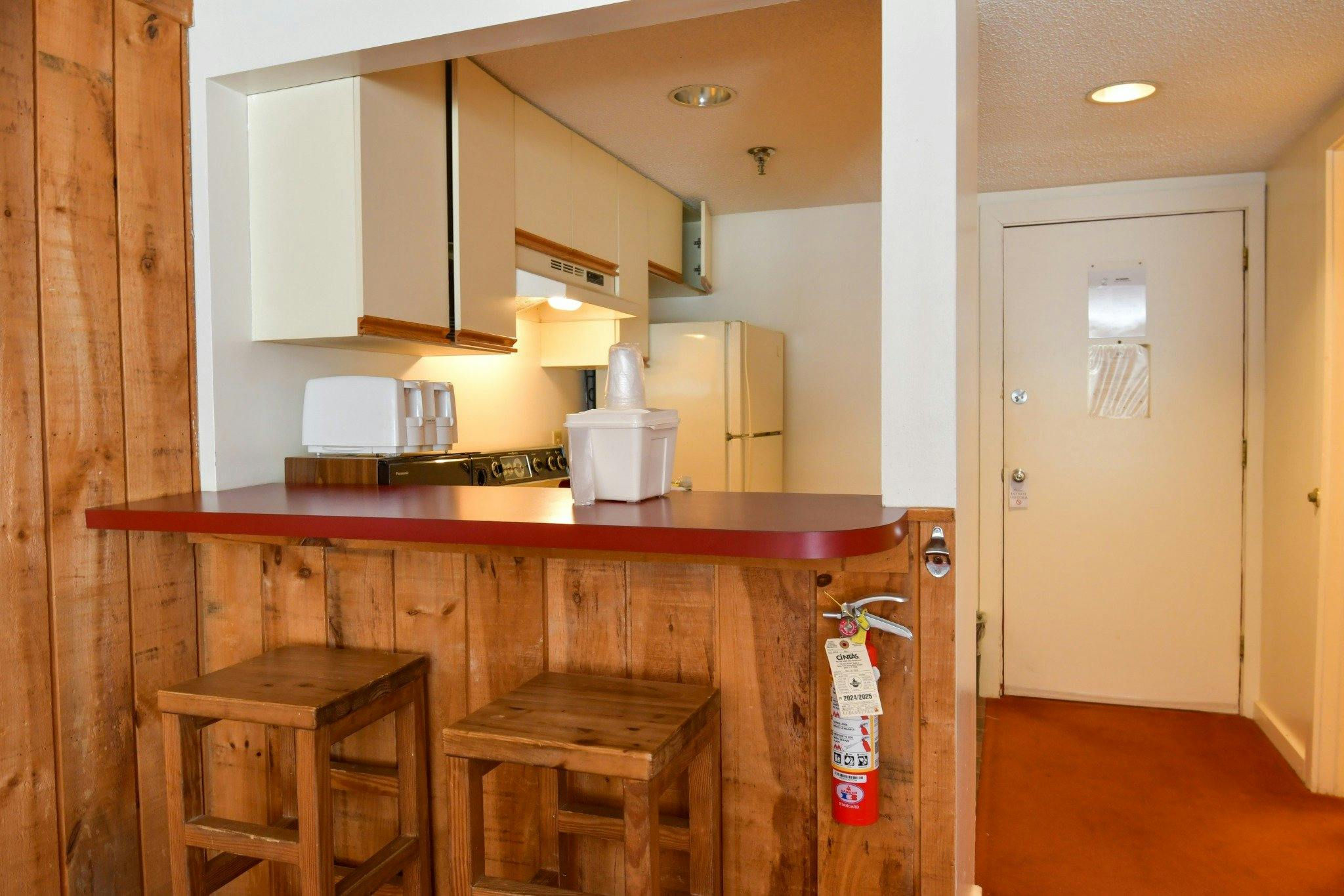 - Full Kitchen with full size fridge, microwave, toaster, coffee maker, dishwasher, stove/oven, table, chairs, counter top, cabinets and sink